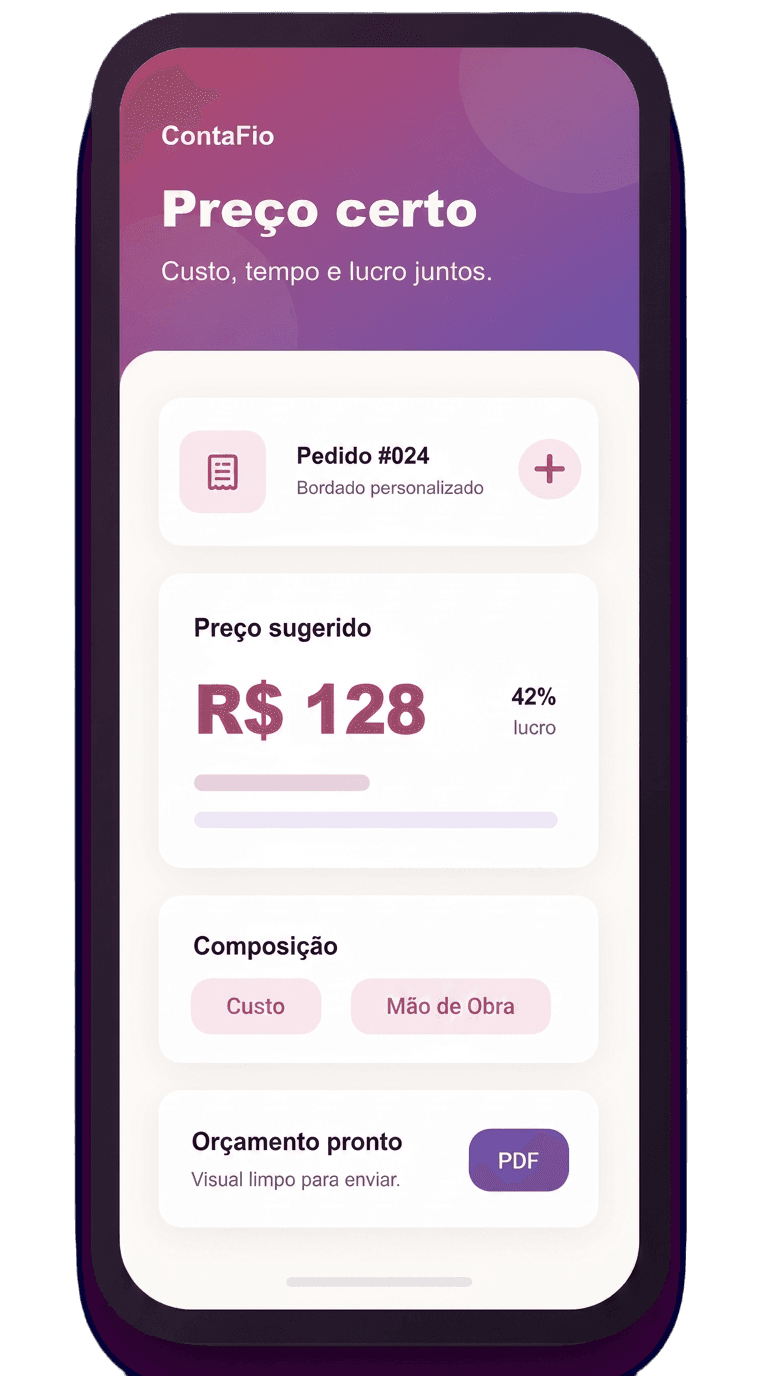 A maior parte do que existe hoje para precificação em bordado e artesanato ainda gira em torno de planilhas de Excel. A ContaFio está nascendo para ser diferente: um sistema online, integrado e pensado para ajudar bordadeiras e ateliês a calcular preço, gerar orçamentos e enxergar o lucro com muito mais clareza.